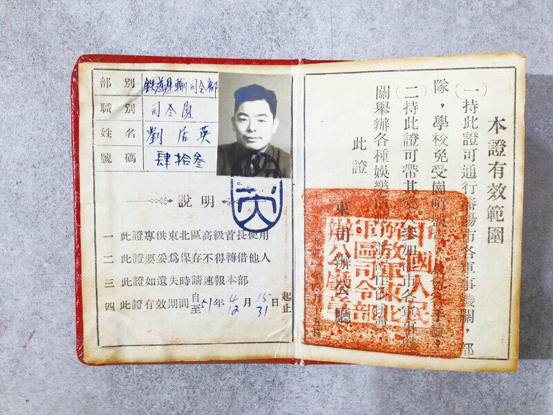 这是一张中国人民解放军东北军区司令部办公厅于1951年4月15日颁发给时任东北军区铁道运输司令部司令员刘居英的特别通行证。该通行证为红色防水油印纸装封皮,封面字均为竖排版,右上角印着宋体字“一九五一年用”,中间带有“八一”字样的红五星下印有黑色繁体字“特别通行证”,左下角印黑色繁体字“东司办公厅制”。内芯2张4页,首页与封面字相同,第2页是“本证有效范围”:“持此证可通行沈阳市各军事机关、部队、学校免受岗哨盘查,及会手续。持此证可带爱人参加沈市各军事机关举办各种娱乐活动,并当作前排票”,上盖 “中国人民解放军东北军区司令部办公厅章”。第3页是带有图片的证件内容:上半部为部别,铁道运输司令部;职别,司令员;号码,肆拾叁。下半部为使用说明:一,此证专供东北区高级首长使用;二,此证要妥为保存不得转借他人;三,此证如遗失时请速报本部;四,此证有效期为1951年4月15日至1951年12月31日。第4页空白。