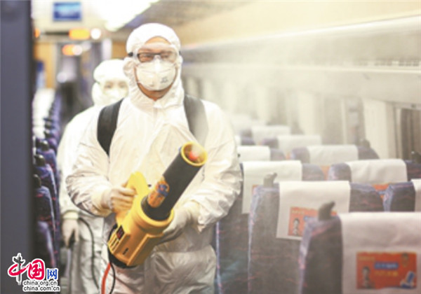 2020年2月5日,杨波在南昌开往北京西D738次列车上进行消毒作业。张学东 摄