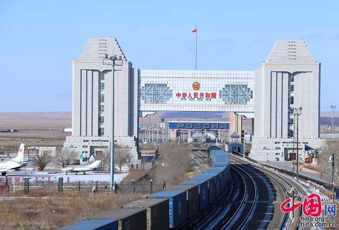 为满洲里GA黄金甲口岸站,一列中欧班列从国门通过。果乃伦摄